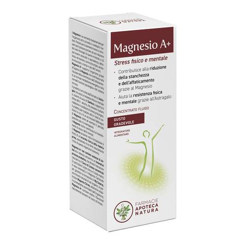 Il Magnesio è un elemento fondamentale per l'organismo ed è coinvolto in molteplici funzioni. Periodi particolarmente intensi e stressanti però possono portare ad una riduzione dei livelli fisiologici di questo minerale, e ciò può essere associato a spossatezza, debolezza, nervosismo, sonno disturbato, tensione muscolare, crampi e calo dell'umore. Magnesio A+ fornisce il 100% della dose giornaliera raccomandata di Magnesio, che contribuisce alla riduzione della stanchezza e dell'affaticamento e alla normale funzione psicologica e del sistema nervoso. Il prodotto inoltre, è arricchito dall'estratto di Astragalo che aiuta la resistenza fisica e mentale e, insieme al succo di Sambuco, supporta le difese dell'organismo, che possono risultare indebolite in condizioni di stress prolungato. Magnesio A+ può risultare utile in tutte le condizioni in cui vi è un accresciuto fabbisogno di Magnesio come ad esempio il periodo premestruale e la menopausa. Il Magnesio presente nella formulazione è frutto di un'accurata ricerca della materia prima, selezionata tra le fonti naturalmente ricche di questo importante elemento. Magnesio A+ non contiene sostanze di sintesi ed è ottenuto attraverso un innovativo processo produttivo, che sfrutta l'interazione naturale tra il Succo di Limone concentrato (in particolare l'acido citrico e l'acido malico in esso contenuti) e il Magnesio Carbonato per garantire la formazione di Magnesio Cospray, una miscela naturale di sali organici, in particolare Magnesio Citrato, altamente solubili e prontamente assimilabili dall'organismo. Magnesio A+ contiene inoltre i flavonoidi naturalmente presenti nel succo di limone.