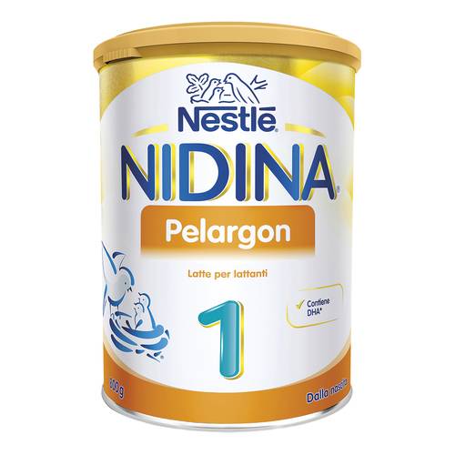 NIDINA Pelargon 1Descrizione Latte per lattanti, idoneo per i lattanti sin dalla nascita quando essi non sono allattati al seno. Contiene DHA (come prescritto dalla legge per tutte le formule per lattanti. Dopo NIDINA Pelargon 1, su indicazione del pediatra, si potrà passare ad un latte di proseguimento come NIDINA Pelargon 2. Ingredienti Latte scremato, oli vegetali (girasole, colza), siero di latte parzialmente demineralizzato e frazionato in polvere, lattosio, amidi, maltodestrine, sali di calcio dell'acido citrico, olio di pesce, Streptococcus thermophilus, citrato di potassio, olio estratto da Mortierella alpina, bitar...